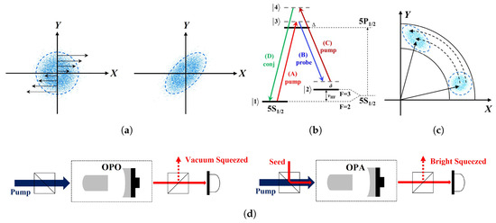 Schematic diagram of several preparation methods for squeezed light. (a) The process by which polarization self-rotation (PSR) leads to a vacuum-squeezed state. (b) Energy levels in double- shape in process of four-wave mixing (FWM). (c) Squeezing of a coherent state by the nonlinear optical Kerr effect in quadrature phase space. (d) Experimental designs of optical parametric oscillation (OPO) and optical parametric amplification (OPA).