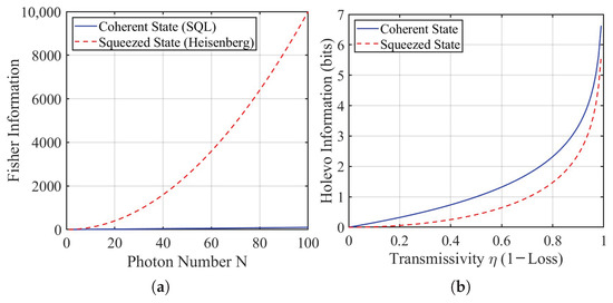 From a quantum information perspective, squeezed light enhances sensing by increasing the Fisher information (FI), which quantifies the amount of information about an unknown parameter (e.g., phase or magnetic field) extractable from a measurement, often leading to input/output gains that approach the Heisenberg limit [100,101]. The Holevo bound, representing the ultimate limit on accessible information in quantum channels, further elucidates how squeezed states mitigate information loss in noisy media, providing robustness at both extremes of sensing: maximal gain in ideal channels and superior performance under decoherence [102,103]. For instance, in quantum channels, squeezed light can yield up to 3 dB FI enhancement compared to coherent states, reducing estimation variance [104]. As illustrated in Figure 4, which presents numerical simulations based on theoretical scaling laws, panel (a) depicts FI as a function of photon number N (ranging from 1 to 100), contrasting the linear scaling (FI ) for coherent states with the quadratic scaling (FI ) for squeezed states, highlighting the potential for enhanced precision in parameter estimation. Panel (b) simulates the Holevo information under varying transmissivity (from 0 to 1), using simplified models such as for coherent states and for squeezed states, to demonstrate reduced information decay and thus greater resilience to loss in squeezed-light scenarios.