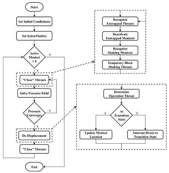 - Retreat: If, after entering the “transition state,” the local driving pressure reverses or decreases due to pressure changes elsewhere in the network such that , the original displacement event is cancelled. The meniscus is released from the “transition state” and may undergo a retreat event within the current time step.
