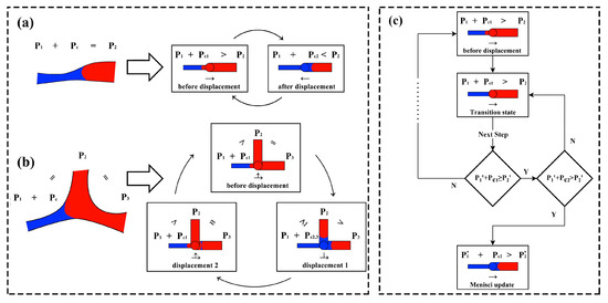 - Pinning: If the driving pressure is insufficient to overcome the next capillary barrier (i.e., ), or the meniscus is recognized as a “shaking” meniscus, then meniscus will be considered “pinned” or “blocked” in the pore between the current throat and the target throat . Its physical location does not change, and its capillary pressure remains . The throat remains in the “transition state” until, in a future time step, the driving pressure increases sufficiently to meet the advance/retreat condition without shaking and then the meniscus can advance/retreat.