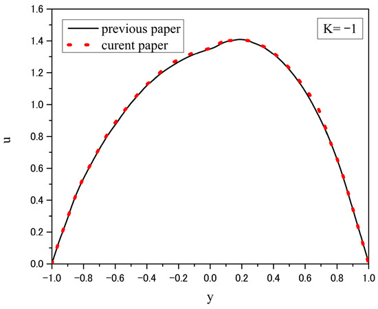 The results for the dimensionless velocity distributions obtained in this study and those from the referenced work are presented in Figure 2. It should be noted that the characteristic velocity used in this study is five times greater than the characteristic velocity used by Malashetty et al. [43]. From the figure, it can be observed that the dimensionless velocity distributions obtained in both studies show good agreement. The maximum difference between them is less than 2%, which is entirely acceptable. This deviation arises because an exact method was used to solve the differential equations in this study, while an analytical approximate method based on regular perturbation was employed in the referenced work.