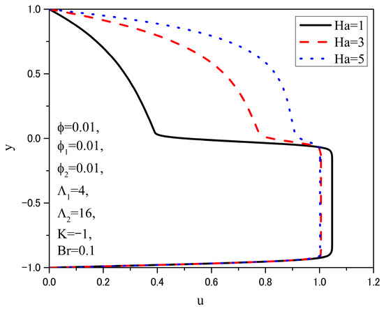 From Figure 3, it can be observed that increasing the Hartmann number leads to an increase in the fluid velocity in the upper layer and a decrease in velocity in the lower layer. Due to the combined effect of the applied electric and magnetic fields, an electromagnetic force—Lorentz force—arises, acting on the fluids in the channel.