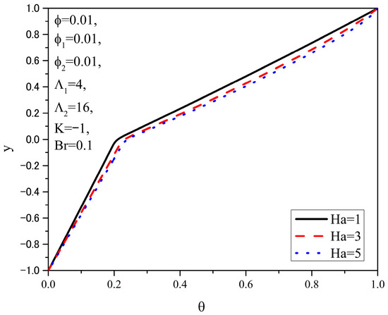 From Figure 4, it can be seen that as the Hartmann number increases, the temperature of the fluid rises in both layers of the channel. The cause of this temperature increase is the enhanced Joule heating, primarily through conduction, and the fact that heat is transferred from the upper wall to the fluid for all considered Hartmann number values.