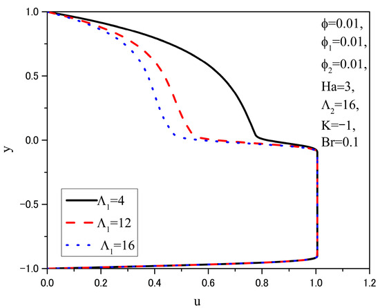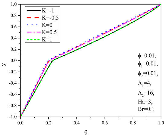 From Figure 5, it can be observed that for K = 0, i.e., when no electric field is applied and all other parameters have the values given in the figure, the velocity of the fluid in the upper layer is low and directed along the x-axis, while the hybrid nanofluid in the lower layer remains at rest. For K = −1 and K = −0.5, the fluid velocity is in the positive x-direction, while for K = 1 and K = 0.5, it is in the negative x-direction. Reversing the sign of factor K, corresponding to a change in the applied electric field direction, reverses the Lorentz force and the flow direction, while increasing |K| enhances the velocity in both layers. The fluid velocities in the upper layer are lower than those of the hybrid nanofluid in the lower layer due to the reason already explained in the analysis of the effect of the Hartmann number.