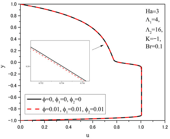 When the upper half of the channel contains the nanofluid Al2O3/oil and the lower half contains the hybrid nanofluid Cu-TiO2/water with nanoparticle volume fractions of 0.01, the fluid velocity in the channel is lower than the velocity when the upper half contains pure oil and the lower half contains pure water, as observed in Figure 9. This velocity reduction is due to the increased density and dynamic viscosity of both the nanofluid and the hybrid nanofluid.