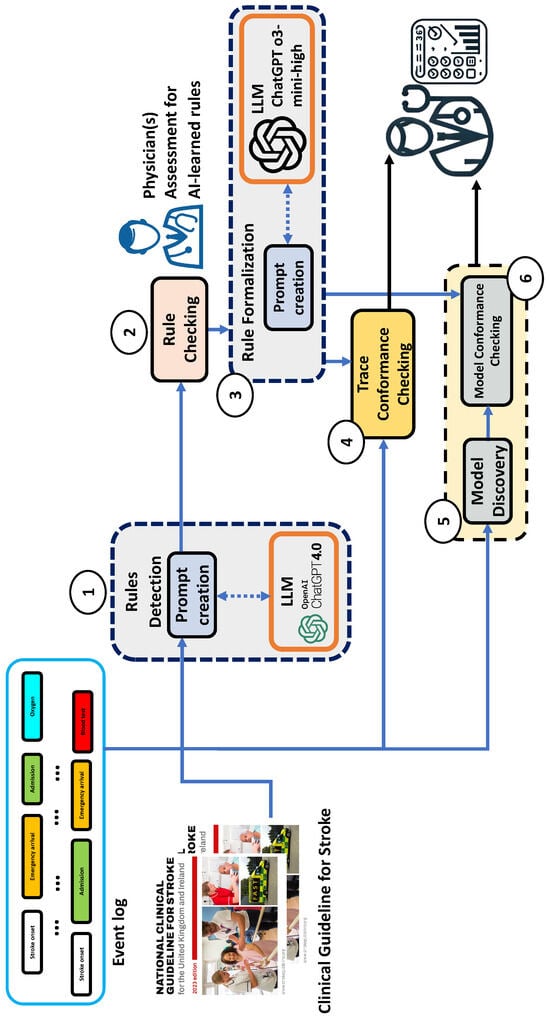 One issue is the need to test the robustness of rule extraction across different LLMs. As a first step in this direction, we have established an experiment relying on Google’s Gemini 2.5 flash, by using the same prompt and the same guideline excerpt we described in Section 4. Gemini outputted only 16 rules, organized into 3 groups. Interestingly, Rule 1, Rule 2, Rule 4, and Rule 5 presented in Section 4 were extracted by Gemini as well. Rule 3, on the other hand, was missing: the LLM identified a couple of generic rules about antiplatelet treatment but not correlated to thrombolysis. Our current choice of relying on GPT is therefore more appropriate. Additional investigations, however, are needed, to assess the performance of the various LLMs. In particular, we would like to test tools that have been specifically trained on healthcare data, such as Google’s Med-Gemini (https://research.google/blog/advancing-medical-ai-with-med-gemini/ (accessed on 20 July 2025)) [], which is part of a growing suite of AI models specifically trained and developed for medical applications.