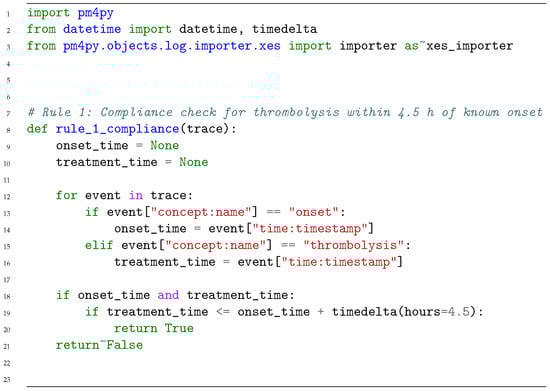 During the rule formalization step (step 3 of our architecture), the rules were converted into a computer-interpretable format. The interested reader can find in the Appendix A an example of the prompt used to generate the Python code for Rule 1 (while the Python code itself is reported in Figure 2). For the construction of the prompt, an input tuple was provided containing the rule text and an example trace from our dataset, for the purpose of providing the LLM with information about process trace data structures in the XES (https://www.xes-standard.org/ (accessed on 15 July 2025)) format. An example XES process trace can also be found in the Appendix A.