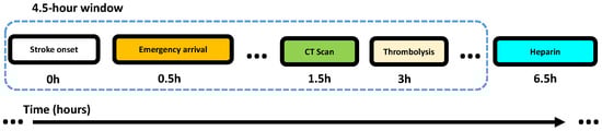 Figure 3 shows an example trace, where Rule 1 is satisfied. The example trace belongs to , since it contains the anchor activity (thrombolysis), and also belongs to , as thrombolysis takes place 3 h after onset (no matter how many activities are completed in between).