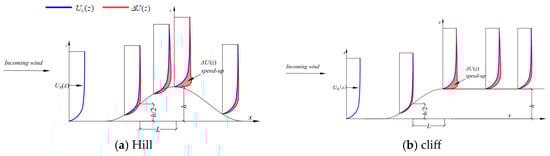 In wind engineering and atmospheric science, the connotation of relevant terminology has evolved. In its former, narrow sense, the term “hilly terrain” primarily referred to idealized landforms composed of relatively regular two-dimensional (2D) ridges or three-dimensional (3D) isolated hills, often used for mechanistic analysis and model validation [2]. However, in the current, broader perspective, its meaning has expanded significantly to encompass both these regular topographies and the “complex terrain” found in the real world, which consists of irregular landforms such as multiple mountain ranges, valleys, and steep slopes [3]. When near-surface wind flows over these topographies, its physical properties undergo drastic changes. For an ideal 2D ridge, the airflow decelerates on the windward slope, accelerates significantly over the crest, and then decelerates again on the leeward side [4], as shown in Figure 2. For a 3D hill, the situation becomes substantially more complex, with the airflow separating behind the crest to form large-scale recirculation zones and intricate vortex structures [5]. This transition from 2D to 3D marks an exponential increase in wind field complexity and poses a fundamental challenge to traditional modeling methods. This review will adopt a broader perspective, encompassing studies on various terrains from idealized hills to real complex topographies.