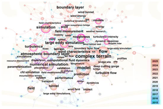 - Shift in Research Objects: “Complex terrain” is the most frequent and central node, far surpassing idealized keywords like “2-D hill.” This indicates a decisive shift in research focus since 2015 from idealized models to more realistic and practical complex terrains.