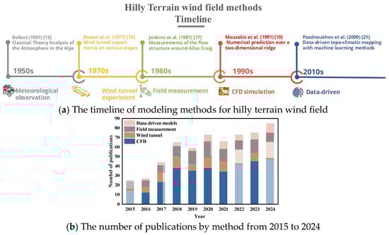 Two primary approaches are commonly employed: experimental methods (full-scale on-site monitoring and reduced-scale wind tunnel testing) and numerical methods. Notably, this review focuses on the period after 2015, as the last decade has been a critical phase of a fundamental “paradigm shift” in the field. This shift is driven by four key factors: first, the leap in High-Performance Computing (HPC) capabilities has transformed high-fidelity Large Eddy Simulation (LES) from an exploratory technique into a viable research tool; second, the explosive growth of Artificial Intelligence (AI) and data-driven algorithms has introduced revolutionary efficiency and new perspectives to wind field modeling [6,7]; third, the research focus has massively shifted from simulating idealized 2D terrains to modeling real 3D complex terrains, which are more aligned with practical engineering needs; finally, there is a growing academic consensus on the necessity of considering the integrated effects of multi-physics coupling, such as thermal, vegetation, and precipitation effects, on the wind field.