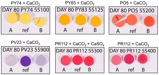 Artificial aging experiments conducted on simplified systems composed of pigment pellets revealed that several SOPs are intrinsically prone to color fading when exposed to visible light. Significant color changes were observed for the tested pigment pellets after light aging (Table 3). Among them, PV23 and PR112 exhibited the most pronounced fading. Under high relative humidity (RH), PV23 showed an exceptionally high ΔE value of 76.2, indicating extreme fading and a near-complete loss of visual identity, as clearly documented in the photographic images (Figure 1). The corresponding shifts in a* and b* values reflect a transition from a violet-blue tone to a dull, whitish color. Even under uncontrolled ambient RH conditions, PV23 exhibited a substantial ΔE of 63.8, confirming its pronounced instability under light exposure regardless of humidity control. The red PR112 pigment showed severe chromatic shifts, with ΔE values reaching 19.8 when calcite is present and 16.7 when both calcite and gypsum are the mineral bases, indicating a significant color fading. Notable color variation was also observed for PO5, with ΔE values up to 9.9 under high RH, suggesting that elevated humidity may enhance the fading process. Overall, the results indicate that constant high relative humidity accelerates and intensifies color fading for PR112, PO5, and PV23.