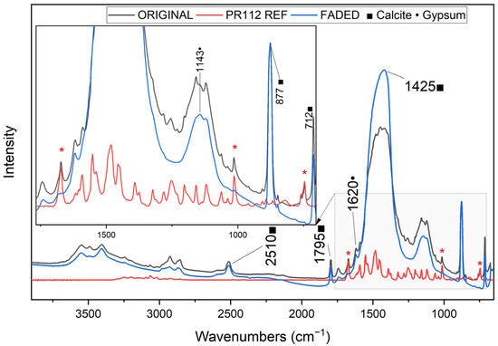 Transmission μ-FTIR spectra (DAC mode) of original (black) and faded (blue) PR112 55300 pigment pellet, alongside the reference PR112 spectrum (red). Characteristic bands of the pigment (red * asterisks) [46] are no longer visible in the aged sample. Peaks attributed to calcite (■) and gypsum (●) are assigned [47,48].