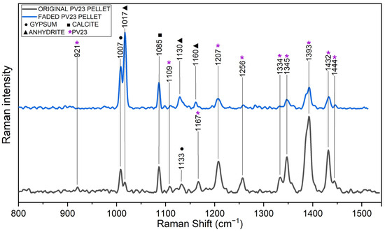In the case of PV23 pellets, FTIR spectroscopy failed to detect any discernible pigment-related signals. However, Raman spectroscopy confirmed a strong decrease in pigment-related peaks (highlighted with purple asterisks in Figure 3 [49]), consistent with the colorimetric analyses (Table 3). Notably, Raman spectra of aged samples revealed a relative increase in the intensity of signals associated with inorganic components (anhydrous calcium sulfate, gypsum, and calcite). Additionally, spectral evidence suggests a transformation of gypsum into anhydrite in the faded spectra.