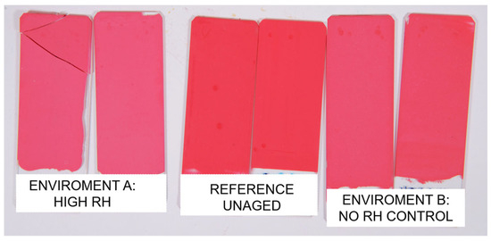 Overall, the results confirm that the degradation of the tested synthetic organic pigments (SOPs) and the resulting color fading can occur independently of the binder matrix. These alterations are strongly influenced by the specific chemical composition of the pigments and the environmental conditions. The presence of the relative humidity (RH) appears to modulate the rate of degradation, although its effect is pigment-dependent.