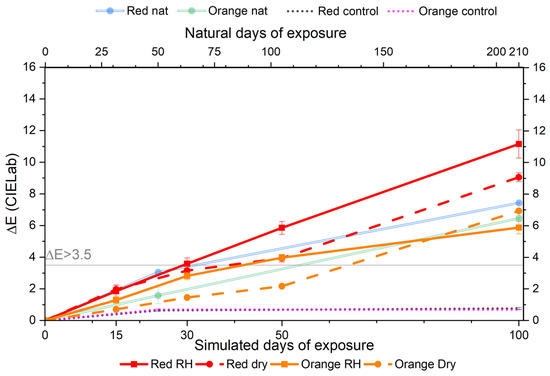 Evolution of ΔE values for red and orange paints mock-ups under the accelerated (bottom x-axis) and natural (top x-axis) light exposure. Solid lines represent high RH conditions; dashed lines indicate uncontrolled RH; and dotted lines show unexposed control samples. Note: artificial and natural aging are not directly equivalent.
