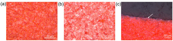 Optical microscopy (Leica DM6 3D, Leica Microsystems, Milan, Italy with an objective of 20×–50×, and LASX software 5.1.0.25593) was used to assess the surface morphology.