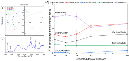 ATR-FTIR analyses of red paint mockups. (a) PCA scores plot at day 0 (RH: black, DRY: green) and day 100 (RH: red, DRY: blue), showing separation between unaged and aged samples under high RH conditions (ellipses indicate 90% confidences); (b) example of FTIR band intensity integration; and (c) evolution of ATR-FTIR bands’ intensity ratios for red paint in high RH aging environment at 0, 15, 30, 50, and 100 days of simulated days of exposure: ratios related to inorganic fillers (black and red line) increase over time, bands associated with binder degradation increase (blue), and binder bands decrease slightly faster than the pigments (purple line).