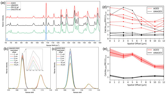 Raman and micro-SORS analyses on red paint mock-ups. (a) Raman spectra at a 0 spatial offset for unaged and aged mock-ups, along with reference spectra of the PR112 pigment and calcite [42,43]; (b,c) average Raman spectra at each offset values, collected from unaged (b) and aged (c) mockup, normalized at 1110 cm−1; (d) ratio plot from individual micro-SORS series; and (e) average ratio plots with standard deviations for unaged and aged paints.