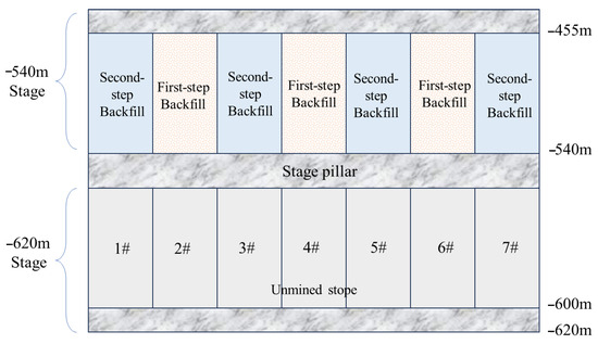 Anhui Masteel Luohe Mining, located in Anhui Province, China, has a production capacity of 5 million tons per annum and uses the sublevel (or subsegment) open-stope subsequent backfilling mining method. The mining operation is divided into two main sections, the −540 m stage and the −620 m stage, with the −540 m stage mined first. The −455 m level serves as the drilling and backfilling return air level, while the −540 m level is the trackless ore extraction level. The designed stope dimensions are 72 m in length, 18 m in width, and 30–85 m in height, as shown in Figure 1, which illustrates the layout of the upper and lower sublevel mining. To reduce backfilling costs, a stepwise backfilling approach is adopted. The designed uniaxial compressive strength (UCS) of the backfill in the first-step stope is 2.2 MPa, and in the second-step stope, 1.0 MPa. The concentration of the backfill is 68% to 70%. The ratio of cement to sand for the first-step is 1:10, and for the second-step is 1:16. The main filling processes include the tailings produced by the concentrator are processed through a deep cone thickener to form high-concentration tailings mortar. The tailings and cementing materials are mixed and stirred in the mixing tank and then transported to the goaf through the filling pipeline.
