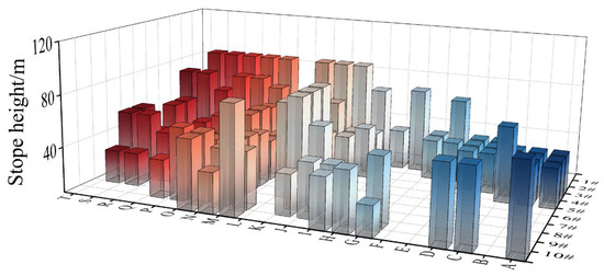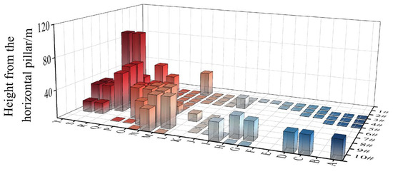 As shown in Figure 2, the height distribution of stope backfills ranges from 30 m to 85 m. In Panel 1, the distribution of high and large stopes (i.e., those with a height exceeding 60 m) is the most extensive, accounting for 65% of the total area. It is well known that backfills in high and large stopes negatively affect floor stability. The pressure exerted by backfills on the floor is essentially vertical stress, primarily due to the self-gravity of the backfill. The compaction load from the upper backfill is transmitted to lower layers through interparticle contact. The greater the stope height, the higher the vertical stress borne by the floor [29]. In addition to the influence of high and large stopes, stopes distributed along exploration lines J to T are relatively dense, which can lead to stress concentration. In contrast, due to the orebody’s occurrence characteristics, no goafs are arranged in Panels 4 to 9 or along exploration lines A to J, so these areas do not impose additional pressure on the floor.
