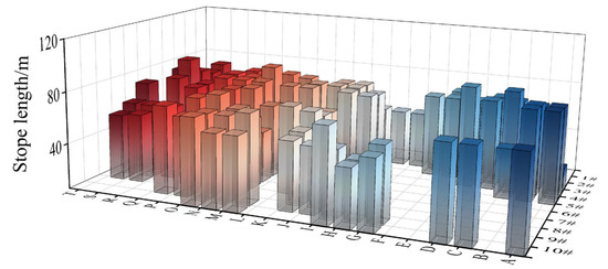 As shown in Figure 3, the length distribution of stope backfills varies slightly, ranging from 50 m to 72 m. Stopes in Panels 1 to 3 have relatively larger lengths, and those along exploration lines L to T are densely distributed. Unlike stope height, which affects floor pressure through vertical stress, the influence of stope length depends more on the horizontal load distribution law and the span effect in structural mechanics. The stope floor can be regarded as a beam on an elastic foundation, where the backfill and overlying loads act as uniformly distributed loads on the beam, and the stope length corresponds to the beam’s span. According to elastic foundation beam theory, stope length directly determines the internal force distribution—bending moment and shear force—of the floor, thus affecting the pressure borne by the floor. When the stope length is small, the bending deformation of the floor beam is minor, and the bending moments are dispersed and low.