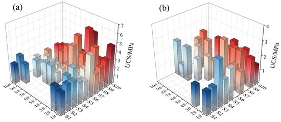 To verify backfill quality, core samples are drilled from the top or bottom of the stope after the backfill has cured, and UCS tests are conducted randomly (Figure 5). According to the mine’s design requirements, the 28-day strength of the backfill in the first-step stopes should reach 2.2 MPa, while that in the second-step stopes should reach 1.0 MPa. The strength distribution of the backfill in stopes that have undergone quality inspection is shown in Figure 6. Figure 6a shows the UCS distribution in the first-step stopes, where the maximum UCS reaches 6 MPa and 83% of the stopes meet the design requirement. In the second-step stopes, UCS values range from 0.85 MPa to 2.67 MPa, with 92% of the stopes exceeding the required strength.