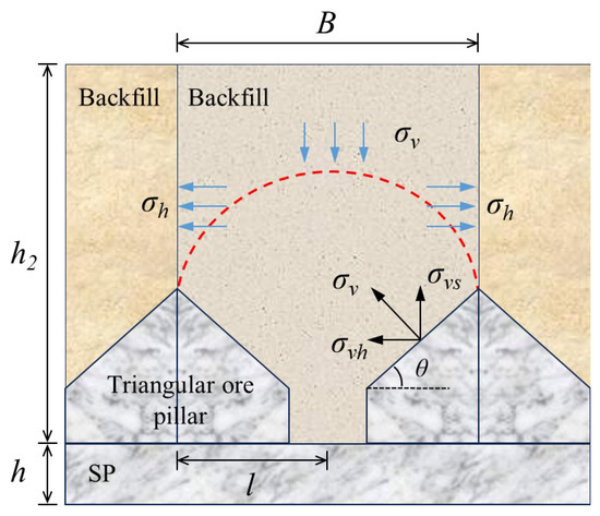Triangular pillars are typically retained during ore extraction at the stope bottom, as shown in Figure 7. The vertical component of the force (σvs) exerted by these triangular pillars on the backfill helps reduce the pressure on the SP [32]. Considering the effect of triangular pillars, the load (q′) of the upper backfill acting on the SP is shown in Equations (1) and (2):