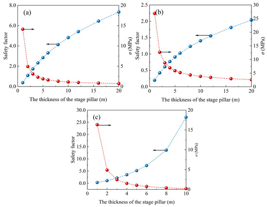 Figure 9a,b show that, under the same SP thickness condition, the safety factor during second-step mining is generally smaller than during first-step mining. During first-step stope mining, the stope sides consist of ore bodies, which provide strong support. The load from the overlying goaf is transferred to the surrounding rock on both sides, creating favorable conditions for goaf stability. In contrast, during second-step mining, the stope sides consist of backfills with a uniaxial compressive strength of 2.2 MPa and cohesion of 0.34 MPa, offering weaker support than the ore. Therefore, the most conservative scenario—the safety factor during second-step mining—should guide the selection of safe SP thickness. The thickness should be at least 6 m, at which point the safety factor is 1.02.