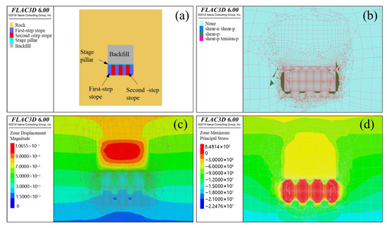 This study employed the finite difference analysis software FLAC3D (Version 6.0) to simulate ground pressure behaviors such as stress distribution and displacement changes in the SP (with a thickness of 6 m) and the lower stope. By comparing the results with the ultimate strength of the ore and surrounding rock, the stability of the SP and stope was assessed. During the mining process, the first-step stope is mined first, followed by the second-step stope, and the process is completed in the form of “mining one step at intervals”. To closely replicate real safety conditions and accurately reflect the actual stress state of the SP and lower stope, the simulation schemes were set as follows: