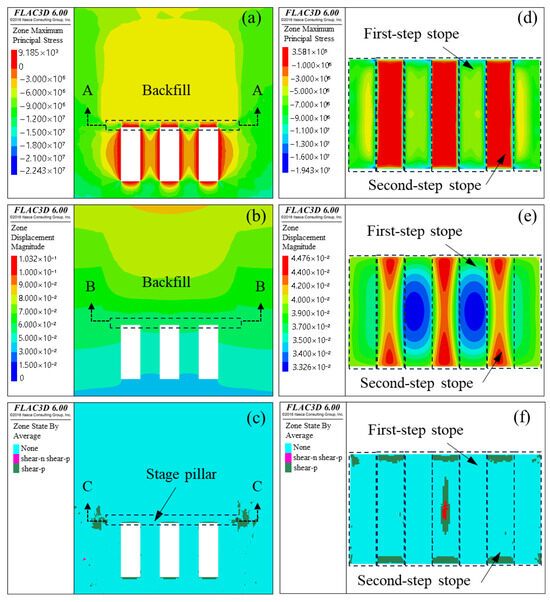 Simulation results for the SP in State II are shown in Figure 12d–f. During second-step mining, the SP experiences localized tensile stress concentration, with the peak tensile stress occurring near the boundary of the newly formed goaf. The maximum tensile stress in the SP is 0.36 MPa, and the maximum displacement is 4.5 cm. No large-scale or through-going plastic failure zones are observed in the SP, and the rock mass remains in an elastic or small-deformation state. After the second-step stope excavation, the plastic zone range around the stope and the SP expands and the development degree deepens (as shown in Figure 12c,f), reflecting a significant increase in the area where the rock mass enters plastic yield. According to the Mohr–Coulomb yield criterion, the formation of the plastic zone results from the rock mass stress exceeding its shear strength, causing irreversible plastic deformation. In Figure 12c, plastic zone patches such as shear-n and shear-p have appeared at the edge of the SP and on the side wall of the stope. The plastic zone of the profile more clearly shows that the plastic zone of the rock mass between the first- and second-step stopes and the side wall of the stope develops in a “strip-like” or “locally through” manner. From the perspective of failure mechanism, the plastic zone of the side wall of the stope is mainly caused by excessive shear stress, which is the result of shear yield of the rock mass under the combined action of horizontal and vertical stress.
