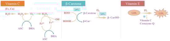 Antioxidant and pro-oxidant activities of vitamin C, vitamin E, and beta-carotene. Vitamin C (ascorbate (ASC)) acts as a water-soluble antioxidant by scavenging free radicals and regenerating oxidized antioxidants, but in the presence of transition metals (Fe or Cu), it can promote hydroxyl radical (·OH) formation through Fenton chemistry, displaying pro-oxidant activity. β-carotene neutralizes peroxyl radicals (ROO·) and quenches singlet oxygen, but at high oxygen tension, may form pro-oxidant species (β-CarOO·). Vitamin E, the major lipid-soluble antioxidant, protects membranes and lipoproteins (LDLs) from lipid peroxidation by donating electrons to lipid radicals, with its oxidized form regenerated by vitamin C and coenzyme Q. Collectively, these vitamins serve as dual modulators of oxidative stress, functioning as antioxidants or pro-oxidants depending on the redox environment.