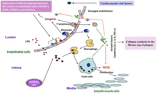 Hypothesis of atherosclerosis. Endothelial injury caused by cardiovascular risk factors promotes the expression of adhesion molecules (PECAM-1, CAMs, VCAM-1, and selectins), enabling leukocyte adhesion and transmigration. Oxidized LDL is taken up by macrophages, leading to foam cell formation and ROS production. These processes trigger cytokine release (e.g., IL-1, IL-6, and TNF-α), smooth muscle cell proliferation, and collagen synthesis, contributing to fibrous plaque development.