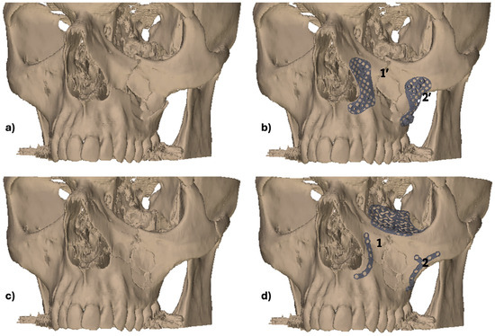 In the initial case, the intraoperative fit of the CAD/CAM-designed guides and implants in the midface was found to be optimal. The additional orbital rim implant enabled highly accurate reconstruction of the orbital frame, and the “one-position-fits-only” design of the orbital implant facilitated precise placement on the dorsal aspect of the orbital rim plate. The precise alignment between the two implants was found to be a distinct advantage in achieving an anatomically correct and functionally stable reconstruction.
