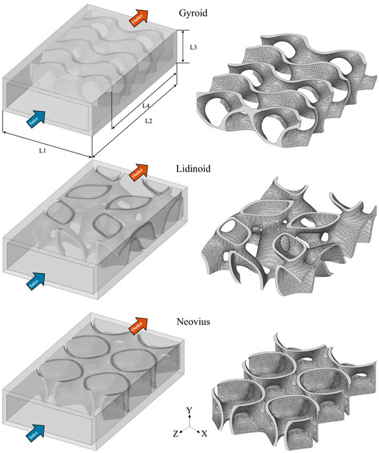 The layout of the gyroid, lidinoid, and Neovius configurations embedded within the micro-combustor. L stands for length.