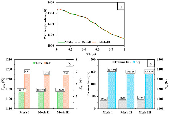 A grid independence test is conducted in this work to confirm accurate prediction of findings while maintaining a reasonable computational cost. As an example, the wall temperature, , , pressure loss, and of a gyroid design configuration integrated into a micro-combustor at an inlet volume flow rate and equivalence ratio of 600 mL/min and 1, respectively, is shown in Figure 2 for three different mesh resolutions with cell numbers of 461,619 (Mesh-I), 988,449 (Mesh-II), and 1,334,940 (Mesh-III). Figure 2a demonstrates that the wall temperature profiles for Mesh-II and Mesh-III are highly similar, whereas Mesh-I underpredicts the wall temperature in the inlet region. The results of and illustrated in Figure 2b support this observation as the discrepancies between Mesh-I and Mesh-III are 1.38 K and 0.14%, respectively, while those between Mesh-II and -III are only 0.03 K and 0.02%. In addition, Figure 2c shows that Mesh-I, compared to Mesh-III, shows a lower prediction of pressure loss by 4.26 Pa and a higher prediction of by 19.69 K. However, the pressure loss and values obtained with the medium mesh resolution (Mesh-II) are roughly the same as those of the high mesh resolution (Mesh-III). Therefore, Mesh-II provides a good balance between accuracy and computational efficiency and is selected for all simulations.