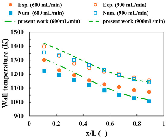 To confirm the reliability of the numerical setup, Figure 3 shows the validation of the modeling approaches used in this work against experimental [55] and numerical [56] findings at an inlet equivalence ratio of unity and velocities of 600 mL/min and 900 mL/min. Similar to the investigations outlined above, Figure 3 illustrates that the wall temperature in this work decreases with the flame’s progression from the inlet to the outlet at different velocities. For the 600 mL/min case, the maximum discrepancies between the results of this work and the experimental and numerical data are 5.1% and 7.03%, respectively, while for an inlet volume flow rate of 900 mL/min, the discrepancies are 3.92% and 4.82%, respectively. These discrepancies from the experimental work could be attributed to uncertainties in temperature measurement, limitations in data acquisition systems, or human errors during experimentation, whereas the numerical errors could result from mesh resolution or the use of different modeling or sub-modeling approaches. In general, the results of this work show high consistency and acceptable levels of deviation, indicating the reliability of the numerical method used in the current investigation.