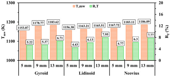 Figure 4 illustrates the impact of the gyroid, lidinoid, and Neovius configurations on and with different internal structure lengths. As seen in Figure 4, transitioning the length from 5 mm to 13 mm exhibits an effective means of gradually enhancing for all structures. This improvement is attributed to the increased surface area, which enhances the heat transfer process from the combustion to the outer walls. Moreover, shorter structures exhibit better wall temperature uniformity across all cases. This is because the 13 mm configurations tend to suppress the free propagation of the hydrogen flame farther downstream from the inlet region. In comparison with other designs, the gyroid structure shows the poorest performance in terms of both and at the 5 mm length. Nonetheless, the proportionally higher porosity of gyroid at the 13 mm length results in a superior performance. Meanwhile, the Neovius design consistently delivers the highest thermal energy to the walls, confirming its potential to enhance heat absorption in the micro-combustor walls.