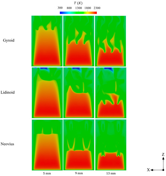 Temperature contours of different lengths of gyroid, lidinoid, and Neovius structures.