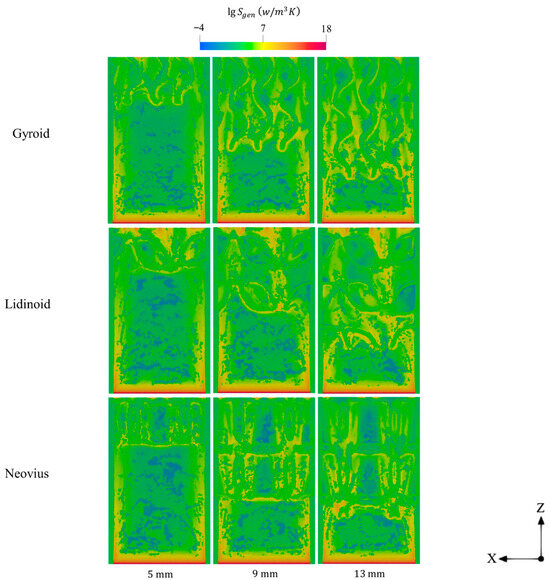 Spatial variations of entropy generations for various lengths gyroid, lidinoid, and Neovius structures.