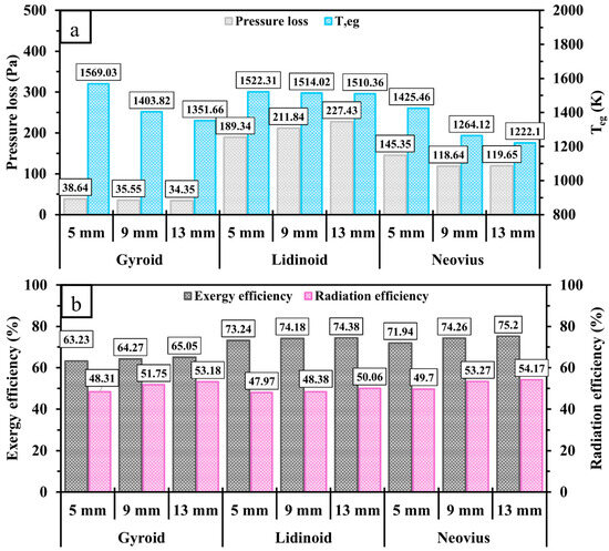 Comparisons of (a) pressure loss, , (b) exergy and radiation efficiencies between gyroid, lidinoid, and Neovius configurations with different lengths.