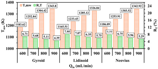 To evaluate the performance of TPMS-based structures housed in micro-combustor applications under different operating conditions, this section examines the effects of increasing the inlet velocity by means of varying the inlet volume flow rate from 600 mL/min to 900 mL/min on key thermal and performance parameters at an equivalence ratio of 1 using the 13 mm TPMS structures.