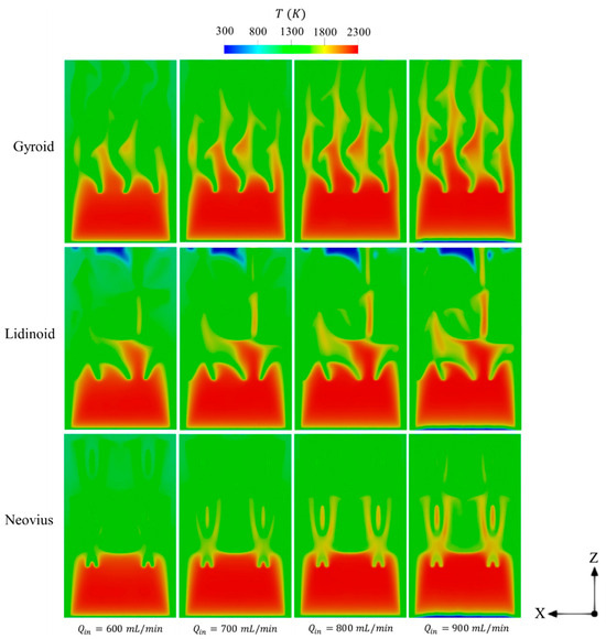 Figure 10 displays the spatial temperature distributions in different TPMS designs under varying . As increases, the high-temperature flame occupies a larger volumetric region within the combustor, driven by the enhanced combustion rate resulting from the increased energy input. In particular, the gyroid configuration allows the high-temperature flame to extend farther downstream, nearly reaching the outlet region, at higher . This broader flame propagation promotes more even heat distribution over the outer surfaces and enables a larger area of the external walls to absorb thermal energy, thereby increasing . These observations explain the superior performance of the gyroid structure as reflected by its highest and lowest temperature uniformity ratio compared to the other configurations as shown in Figure 9.