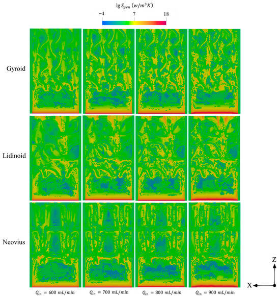 The distribution of total entropy generation throughout the domain of gyroid, lidinoid, and Neovius designs with respect to different .