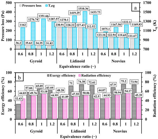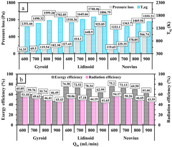 A comparison of (a) pressure loss, , (b) exergy and radiation efficiencies for gyroid, lidinoid, and Neovius designs at various .