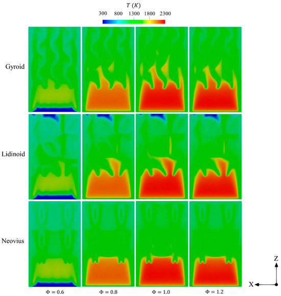 To optimize the operating conditions, this subsection compares the performance of the proposed TPMS configurations with respect to various equivalence ratios between 0.6 and 1.2 to investigate the effects of fuel-lean and fuel-rich conditions on micro-combustor performance. Based on the findings of the previous subsection, an inlet volume flow rate of 600 mL/min is identified as the optimal condition. Therefore, this inlet volume flow rate is used for all subsequent simulations in this subsection.