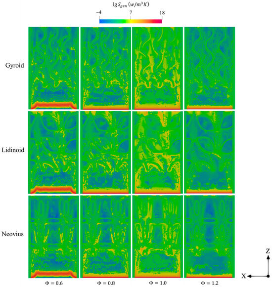Figure 11 illustrates the effects of employing TPMS structures in micro-combustors on entropy generation. Supplying the system with higher amounts of fuel results in more intense combustion, which increases entropy generation through chemical reaction and diffusion mechanisms, which are caused by elevated reaction rates and species consumption, respectively. As shown in Figure 11, the regions of peak entropy generation near the inlet (where combustion is initiated) tend to expand with increasing across all geometries. Furthermore, higher lead to more chaotic entropy distribution throughout the combustor domain, indicating greater overall entropy generation under these conditions.
