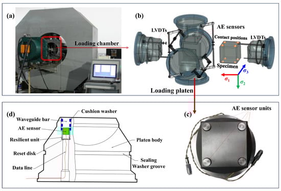 Experimental system. (a) 3D loading and AE acquisition system, (b) 3D stress chamber with loading platens, (c) the loading platen integrated with AE sensor units and (d) the inner structure of an individual AE unit.