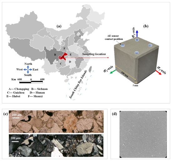 The sandstone used in this study was sourced from Chongqing, situated on the eastern margin of the Sichuan Basin, China (Figure 2a). This material was selected due to its prevalence in underground engineering projects. All specimens were machined to precise dimensions conforming to ISRM standards, resulting in 100 mm cubes with dimensional tolerances of ±0.02 mm, and flatness and parallelism within ±0.01 mm. To minimize stress concentrations and avoid interference between loading directions, all edges were chamfered by 5 mm (Figure 2b). The high geometric symmetry of the cubic specimens enables flexible and controlled loading paths [28,29].