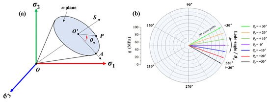 Significance of the loading paths. (a) 3D stress space, (b) the variation of θσ in the π-plane.